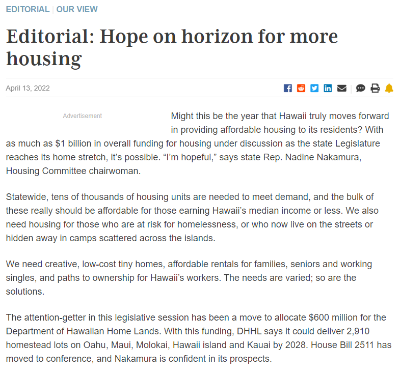 Representative Nakamura was quoted in a Star Advertiser article, which discusses current legislation to accommodate the demand for affordable housing in Hawaii.